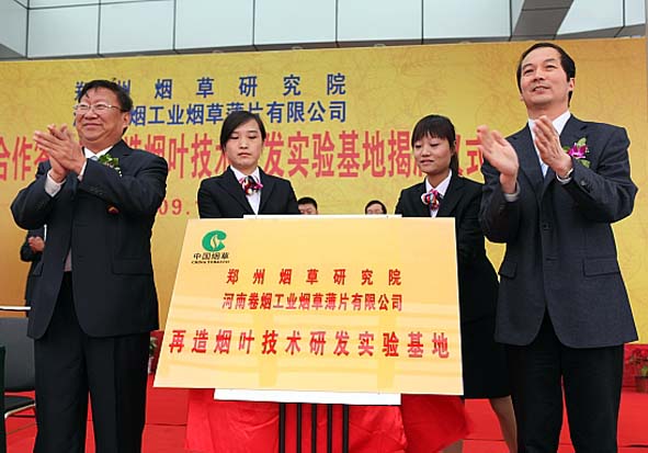 | 10月19日,我院與河南卷煙工業(yè)煙草薄片有限公司在許昌簽署技術合作協(xié)議,合力建設再造煙葉技術研發(fā)實驗基地。閆亞明院長與河南中煙副總經(jīng)理、薄片公司董事長宋有申共同為實驗基地揭牌。