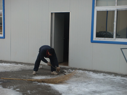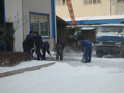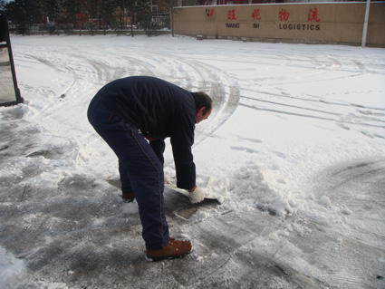 2月11日,徐州普降今冬第一場大雪。今天是上班最后一天,盡管道路很滑,大家依然按時到達(dá)公司。個別同事甚至一路步行過來上班。到公司后,發(fā)現(xiàn)早到的同事已經(jīng)開始自覺的清掃積雪。由于昨晚下了大量凍雨,地面早已結(jié)冰,積雪掃干凈后,地面依然很滑。大家八仙過海各顯神通,有的拿掃帚、有的用鐵鍬、有的用鐵棍、鐵板等各種工具來鏟除滑冰,清理路面,以確保大家的出行安全及生產(chǎn)活動的正常開展。