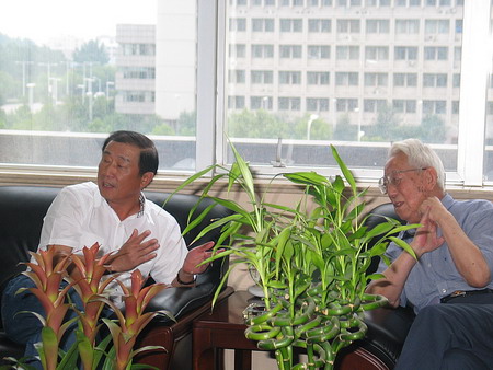 參觀完院區(qū),周昌貢總經(jīng)理一行看望了朱尊權(quán)院士和袁行思老院長。一見到來自湖南的客人,朱老就關(guān)切地詢問湖南煙葉的種植情況并向他們表達了要在煙田建車間的愿望。周昌貢總經(jīng)理很欽佩朱老能在耄耋之年依然關(guān)心煙草農(nóng)業(yè)生產(chǎn),并表示如果朱老的建議能被采納,愿意將湖南中煙下屬的某個煙葉生產(chǎn)基地作為朱老這一創(chuàng)新想法的第一塊試驗田。
