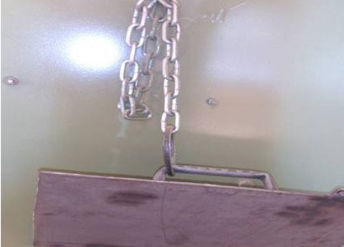 為此,生產(chǎn)加工車間通過開展QC小組活動(dòng),對(duì)預(yù)壓機(jī)雙向喂料皮帶維護(hù)保養(yǎng)難的問題進(jìn)行攻關(guān),對(duì)設(shè)備進(jìn)行小的改造,在雙向輸送帶側(cè)板兩邊各自開了兩個(gè)清灰口,在清灰口上安裝了一道可以打開關(guān)閉的門,在門上安裝防止脫落的鐵鏈,鐵鏈上有一個(gè)掛鉤便于清灰時(shí)將門固定在鐵鏈上,這樣清理人員可以安全的站在檢修平臺(tái)上進(jìn)行徹底的清里。見圖二。