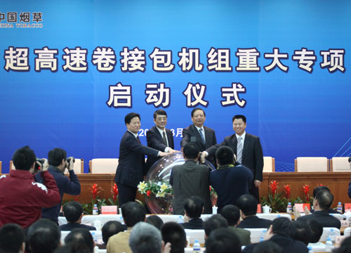 在本次會議上,還舉行了超高速卷接包機組預訂單簽字儀式和超高速卷接包機組重大專項啟動儀式。中國煙草機械集團分別與上海煙草集團有限責任公司、云南中煙工業(yè)有限責任公司等十家國產(chǎn)超高速卷接包機組的用戶單位簽署了超高速卷接包機組預訂單。國家煙草專賣局科技司司長金忠理宣讀了《國家煙草專賣局關于啟動超高速卷接包機組研制重大專項的通知》,正式啟動實施超高速卷接包機組重大專項。