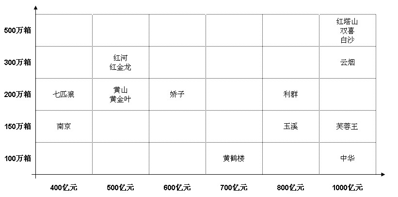 目標高調(diào)、意在占位。在532、461目標提出之后,似乎在一夜之間,中國的卷煙品牌突然異乎尋常的高調(diào)起來。是的,以500萬箱、300萬箱、200萬箱和1000億元、600億元、400億元作為發(fā)展目標,這些品牌想不高調(diào)都難。到目前為止,銷量目標設定為500萬箱的品牌有白沙、紅塔山、雙喜,300萬箱的有紅河、紅金龍、云煙,200萬箱的有七匹狼、黃山、黃金葉、嬌子、利群;商業(yè)銷售收入目標設定為1000億元的有中華、芙蓉王、紅塔山、雙喜、白沙、云煙,800億元的有玉溪、利群,700億元的有黃鶴樓,600億元的有嬌子、500億元的有紅河、紅金龍、黃山、黃金葉,400億元的有七匹狼、南京;同時,以商業(yè)銷售收入為主要訴求的品牌同樣設定了規(guī)模目標,中華、黃鶴樓設定為100萬箱,芙蓉王、玉溪、南京同為150萬箱。但是,上述品牌的實際情況與目標設定還有巨大的差距,有些目標甚至可以理解為“不靠譜”,過于宏大和冒進。