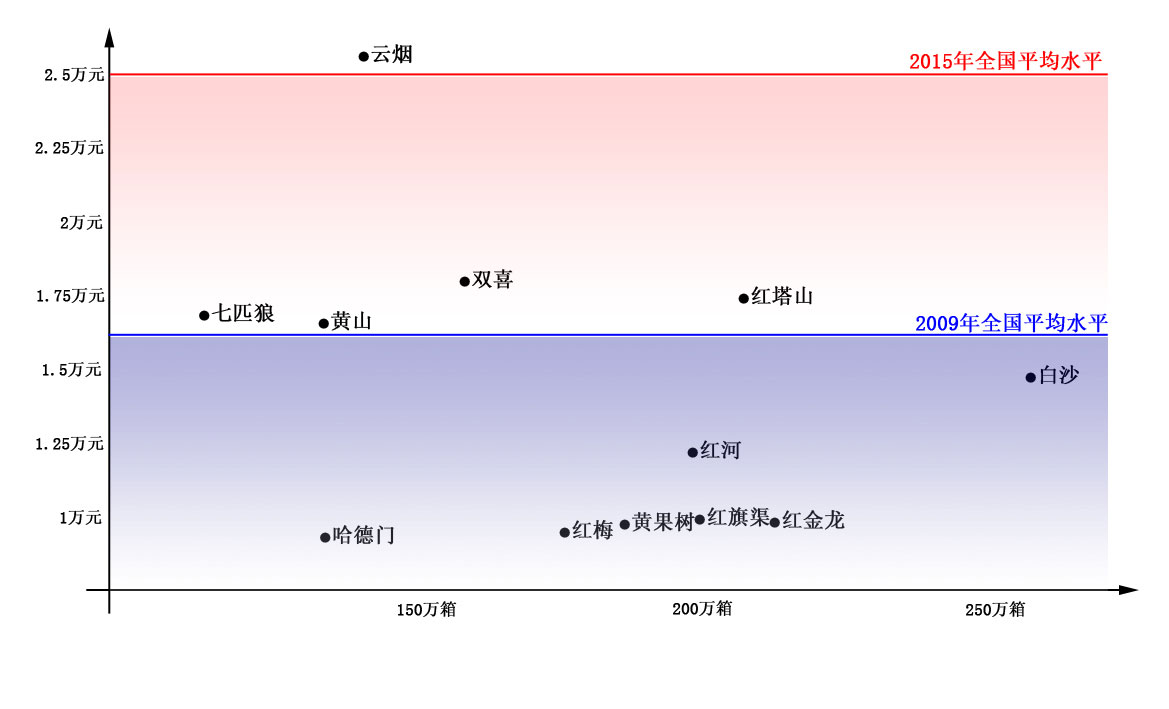 結構問題才是根本。在2009年的12個百萬箱品牌中,僅有云煙、雙喜、紅塔山、七匹狼、黃山等5個品牌商業(yè)單箱批發(fā)均價高于全國平均水平,其中又只有云煙屬于結構、規(guī)模協(xié)調(diào)發(fā)展,雙喜、紅塔山、七匹狼、黃山的單箱批發(fā)均價也僅是略高于全國平均水平,且結構增幅遠低于全國平均水平,幾個品牌的產(chǎn)品線布局主要以三類煙為主,輔以少量一、二類煙,七匹狼、黃山兩個品牌還有相當比重的四類煙。其余7個百萬箱品牌商業(yè)單箱批發(fā)均價明顯低于全國平均水平,特別是“十二五”期間寄望于實現(xiàn)500萬箱、300萬箱銷量的白沙、紅河、紅金龍,結構問題已經(jīng)成為影響品牌下一步發(fā)展的主要制約因素。同時,根據(jù)目前全國卷煙消費水平推算,預計到2015年前后,全國卷煙單箱批發(fā)均價有望達到2.5萬元水平,按照這樣一個增長預期,規(guī)模型品牌在未來3-5年還需要保持至少兩位數(shù)的結構增幅。