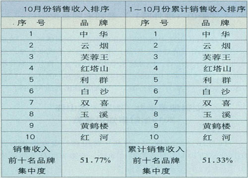 2010年10月份一類煙銷量前十名品牌集中度情況(以百牌號為基礎(chǔ))